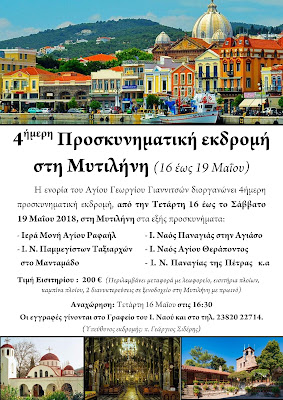 Η ενορία Αγίου Γεωργίου Γιαννιτσών διοργανώνει 4ήμερη προσκυνηματική εκδρομή, από την Τετάρτη 16 έως το Σάββατο 19 Μαΐου 2018, στη Μυτιλήνη στα εξής προσκυνήματα: