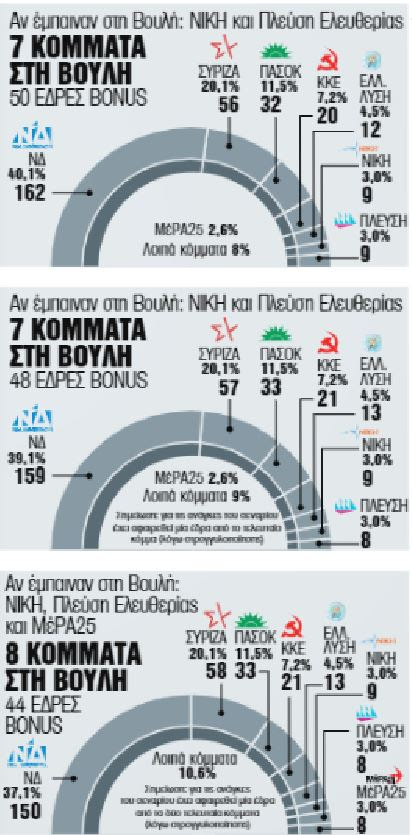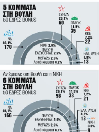Στην περίπτωση που η ΝΔ λάμβανε 39% δεν θα αποσπούσε όλο το bonus, αλλά 48 έδρες. Η ευνοϊκή συγκυρία του 11,6% χωρίς εκπροσώπηση θα απέδιδε 159 έδρες στην αυτοδύναμη ΝΔ.