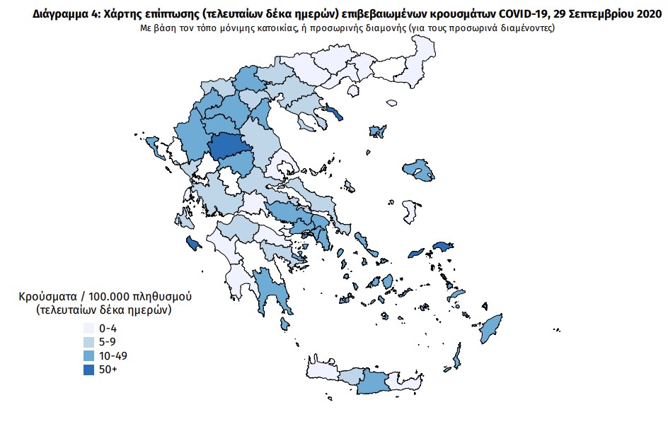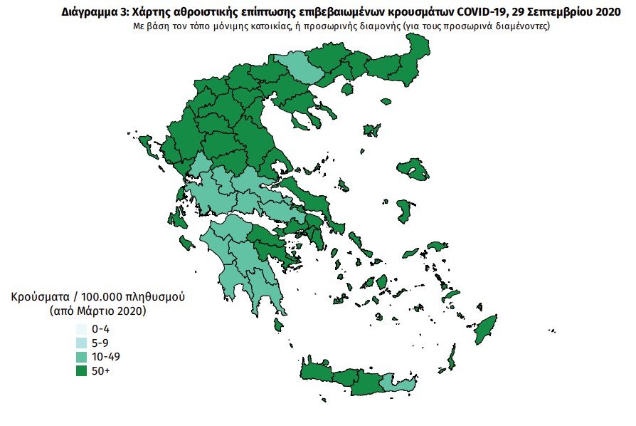 Ο χάρτης αποτυπώνει τη γεωγραφική κατανομή των συνολικών κρουσμάτων COVID-19 (από την αρχή της επιδημίας) ανά Περιφερειακή Ενότητα της χώρας, με βάση την δηλωθείσα διεύθυνση μόνιμης κατοικίας του ασθενούς, ή τη διεύθυνση προσωρινής διαμονής για τους τουρίστες και άλλους προσωρινά διαμένοντες στην Ελλάδα.