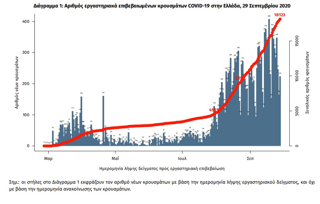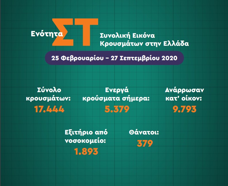 Σύμφωνα με ενημέρωση του υπουργείου Υγείας, από τις 25 Φεβρουαρίου μέχρι τις 27 Σεπτεμβρίου έχουν καταγραφεί 17.444 κρούσματα, εκ των οποίων τα 5.379 είναι ενεργά.