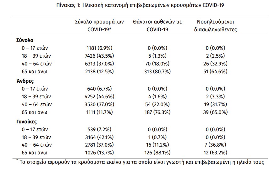 Η διάμεση ηλικία των θανόντων συμπολιτών μας ήταν τα 78 έτη και το 96.6% είχε κάποιο υποκείμενο νόσημα ή/και ηλικία 70 ετών και άνω.