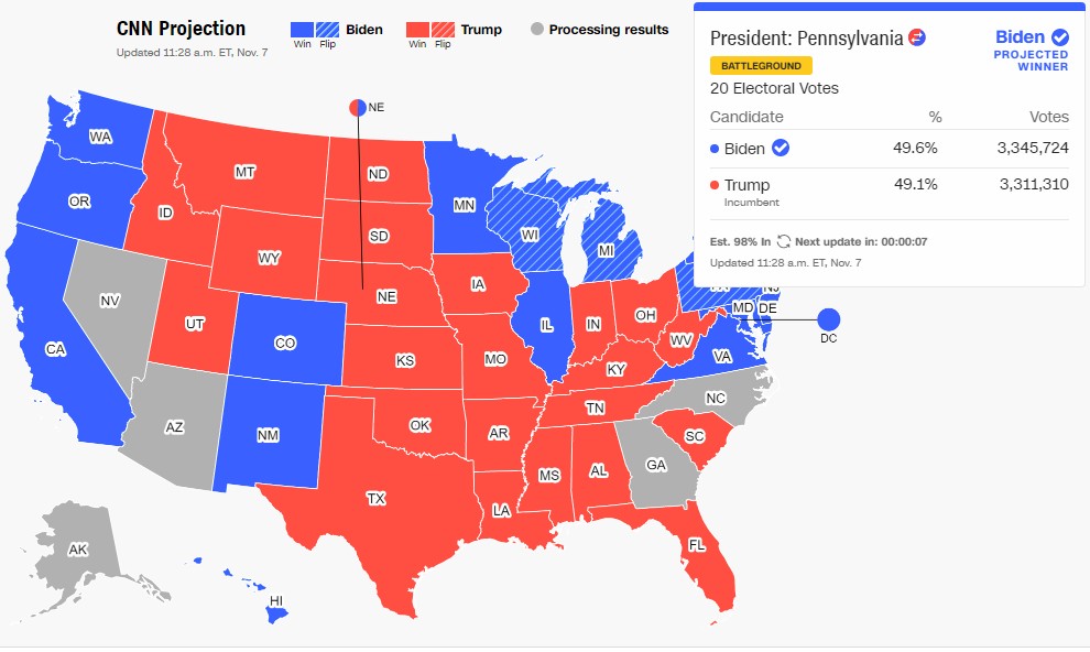 Σύμφωνα με τις προβολές του Edison Research και μεγάλων τηλεοπτικών δικτύων, περιλαμβανομένου του CNN και του NBC, ο Μπάιντεν θα εξασφαλίσει περισσότερους από τους 270 εκλέκτορες που χρειάζεται για να εκλεγεί πρόεδρος των ΗΠΑ.