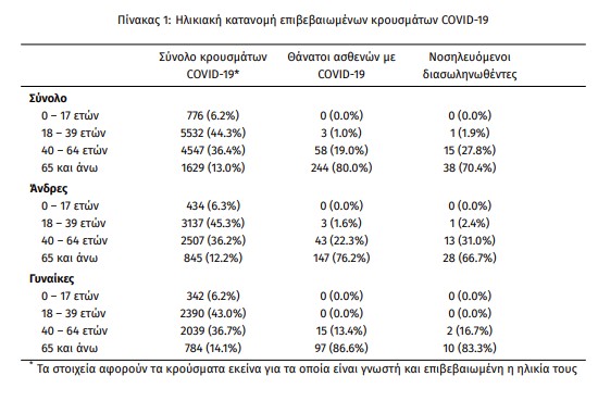 Η μέση ηλικία των κρουσμάτων είναι 39 έτη (εύρος 0 έως 102 ετών), ενώ η μέση ηλικία των θανάτων είναι 78 έτη (εύρος 35 έως 102 ετών). Η ηλικιακή κατανομή των (α) συνολικών κρουσμάτων, (β) των περιστατικών που κατέληξαν σε θάνατο και (γ) των ασθενών που νοσηλεύονται διασωληνωμένοι, είναι η ακόλουθη: