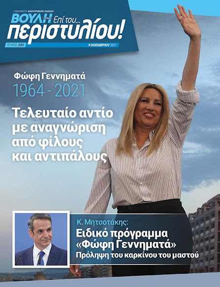 • Ένα μεγάλο αφιέρωμα στη Φώφη Γεννηματά κυριαρχεί στο 30ό τεύχος του ηλεκτρονικού περιοδικού της Βουλής «Επί του… Περιστυλίου!» που αναρτήθηκε χθες στον ιστότοπο του ελληνικού κοινοβουλίου.