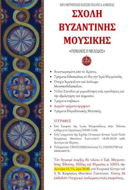 Την Δευτέρα 15 Νοεμβρίου, ώρα 8.00 μ.μ., στο Ενοριακό Κέντρο του Ι. Ναού Κοιμήσεως της Θεοτόκου Γιαννιτσών, όπου στεγάζεται η Διοίκηση της Σχολής Βυζαντινής Μουσικής της Ι. Μητροπόλεως, ο Σεβ. Μητροπολίτης Εδέσσης, Πέλλης και Αλμωπίας κ. Ιωήλ θα τελέσει Αγιασμό για την έναρξη των μαθημάτων και θα επιδώσει Πτυχία και Διπλώματα στους αποφοίτους.