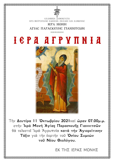 Την Δευτέρα 11 Οκτωβρίου 2021και ώρα 7.00 μ.μ. στην Ιερά Μονή Αγίας Παρασκευής Γιαννιτσών θα τελεσθεί Ιερά Αγρυπνία κατά την Αγιορειτική τάξη για την εορτή του οσίου Συμεών του Νέου Θεολόγου.