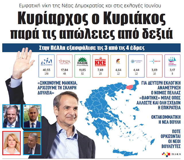 Κατά αρχήν, βλέπουμε μια κάμψη της ΝΔ στην Πέλλα, αφού το αποτέλεσμα έδειξε ότι σε σχέση με τις εκλογές του Μαΐου, η εκλογική δύναμη, έχει πέσει σχεδόν κατά τρείς ποσοστιαίες μονάδες.
