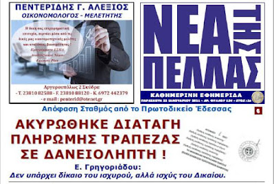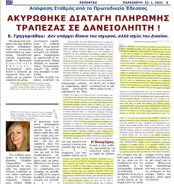 Μια εξαιρετική απόφαση που έχει έκδηλο νομικό ενδιαφέρον αλλά και κοινωνικές προεκτάσεις και αφορούσε δανειδότηση τοπικής επιχείρησης, έλαβε το Μονομελές Πρωτοδικείο Έδεσσας. Συγκεκριμένα έγινε δεκτή η ανακοπή με σημαντικό λόγο ανακοπής και με χαμένα ασφαλιστικά μέτρα.