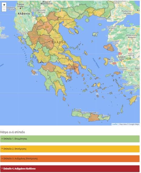 Ο χάρτης περιλαμβάνει τέσσερα επίπεδα προληπτικών μέτρων και κανόνων για κάθε περιφερειακή ενότητα της χώρας (Επίπεδο 1 – Ετοιμότητας, Επίπεδο 2 – Επιτήρησης, Επίπεδο 3 – Αυξημένης Επιτήρησης και Επίπεδο 4 – Αυξημένου Κινδύνου).