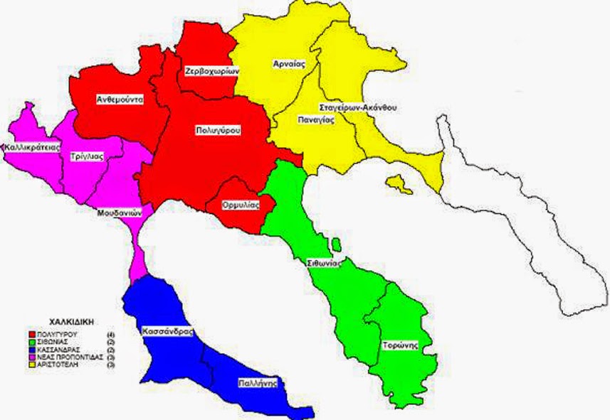 στο νομό Χαλκιδικής και με βάση τον Καλλικράτη δημιουργήθηκαν 5 Δήμοι. Σύμφωνα με πληροφορίες το ποιο πιθανό σενάριο που επεξεργάζονται στον ΣΥΡΙΖΑ έχουν να κάνουν με το σπάσιμο των Δήμων Αριστοτέλη, Πολυγύρου και Νέας Προποντίδας και διατήρηση των Δήμων Σιθωνίας και Κασσάνδρας. Το σχέδιο θα τεθεί στο συνέδριο της ΚΕΔΕ που θα γίνει στην Χαλκιδική τον Μαϊο ενώ αναμένεται να μπει στη συνέχεια σε τοπική διαβούλευση ώστε το 2016 στο νέο ετήσιο συνέδριο της ΚΕΔΕ να παρθούν οι οριστικές αποφάσεις και εκ των υστέρων να γίνει νόμος της πολιτείας και να πάρει ΦΕΚ. Οι προτάσεις του ΣΥΡΙΖΑ σύμφωνα με πληροφορίες είναι οι ακόλουθες: