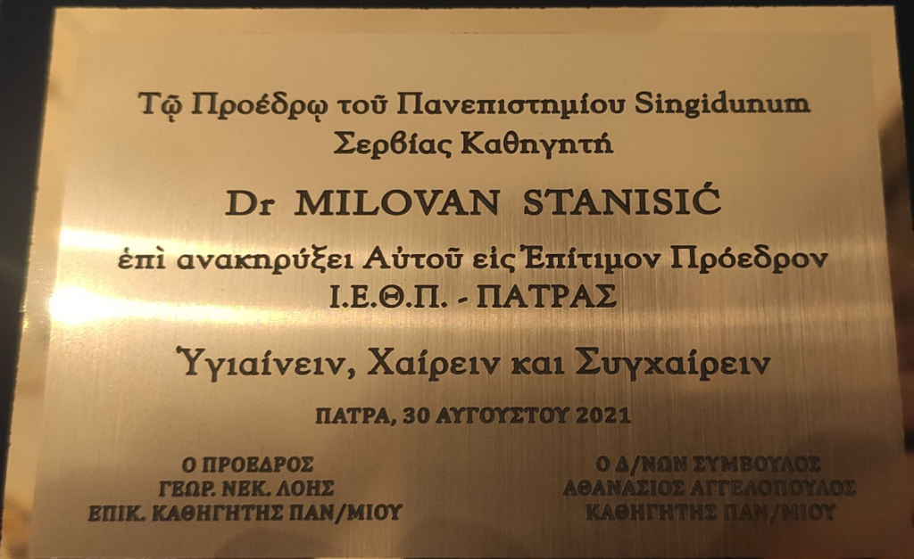 Μετά από ομόφωνη απόφαση του «Ιδρύματος Εθνικού και Θρησκευτικού Προβληματισμού Πάτρας» (συν.30/08/21), απονεμήθηκε στον Καθηγητή και Πρόεδρο του Πανεπιστημίου Singidunum – Βελιγραδίου (Σερβίας) κ. Milovan Stanišić ο τίτλος του «Επιτίμου Προέδρου», ως επάξια αναγνώριση για την ευρύτερη προσφορά του στα ερευνητικά αντικείμενα του Ι.Ε.Θ.Π. που αφορούν την εμβάθυνση των Ελληνο-Σερβικών σχέσεων.