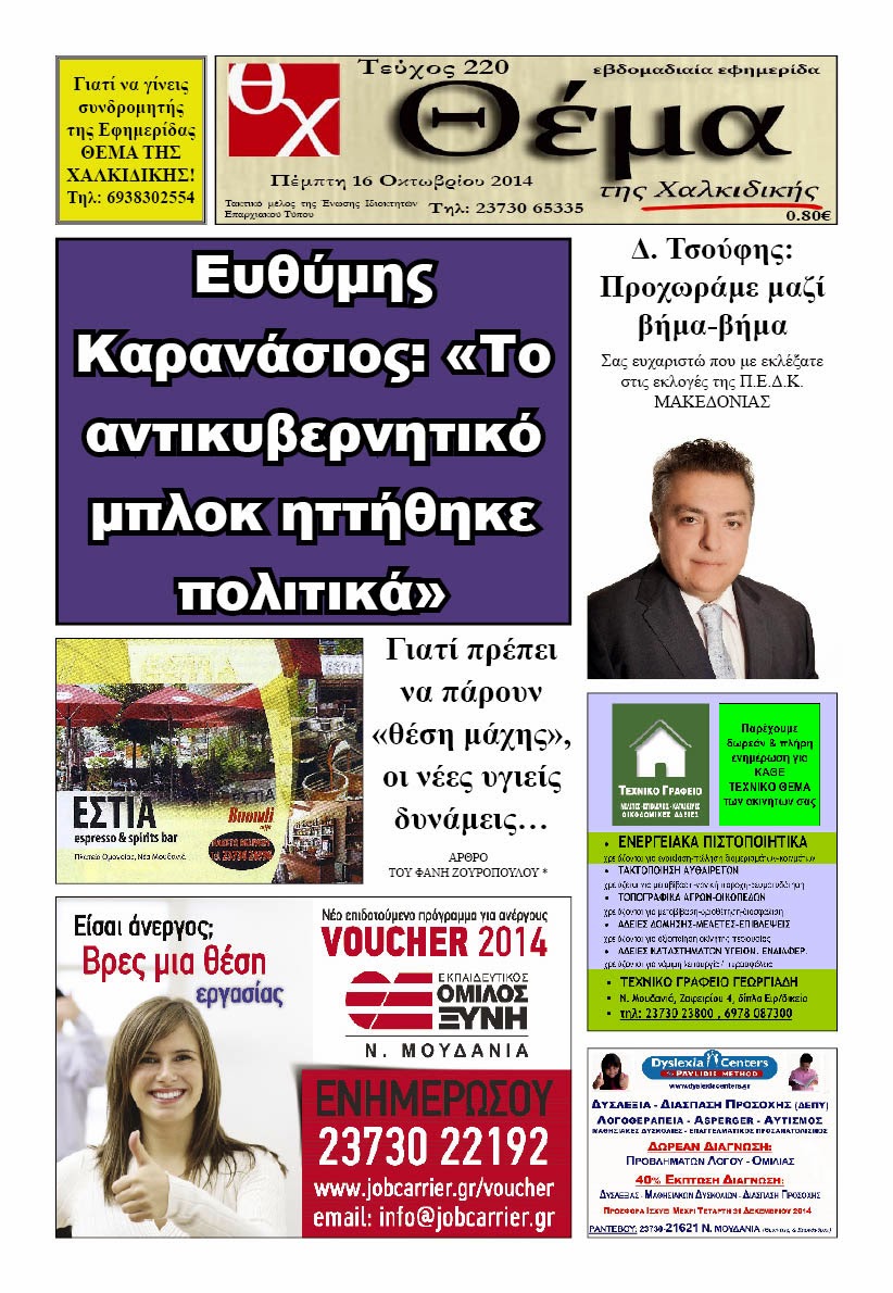 Πρωτοσέλιδα ΕΒΔΟΜΑΔΙΑΙΑ ΕΦΗΜΕΡΙΔΑ ΤΟΥ ΝΟΜΟΥ ΧΑΛΚΙΔΙΚΗΣ “ΘΕΜΑ” ΤΕΥΧΟΣ 220 Χρήστος Δημητριάδης20/10/2014037 views