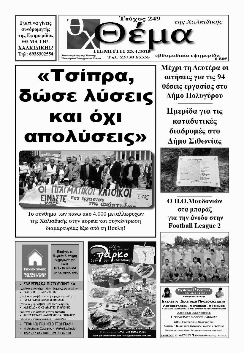 Πρωτοσέλιδα ΕΒΔΟΜΑΔΙΑΙΑ ΕΦΗΜΕΡΙΔΑ ΤΟΥ ΝΟΜΟΥ ΧΑΛΚΙΔΙΚΗΣ “ΘΕΜΑ” ΤΕΥΧΟΣ 249 Χρήστος Δημητριάδης22/04/2015025 views