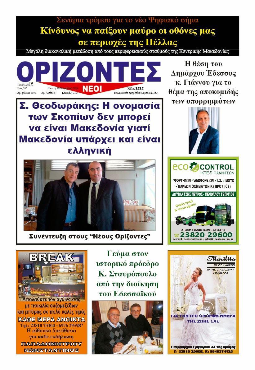 Πρωτοσέλιδα ΕΒΔΟΜΑΔΙΑΙΑ ΕΦΗΜΕΡΙΔΑ ΤΟΥ ΝΟΜΟΥ ΠΕΛΛΑΣ “ΝΕΟΙ ΟΡΙΖΟΝΤΕΣ” ΤΕΥΧΟΣ 1190 Χρήστος Δημητριάδης19/11/2014046 views