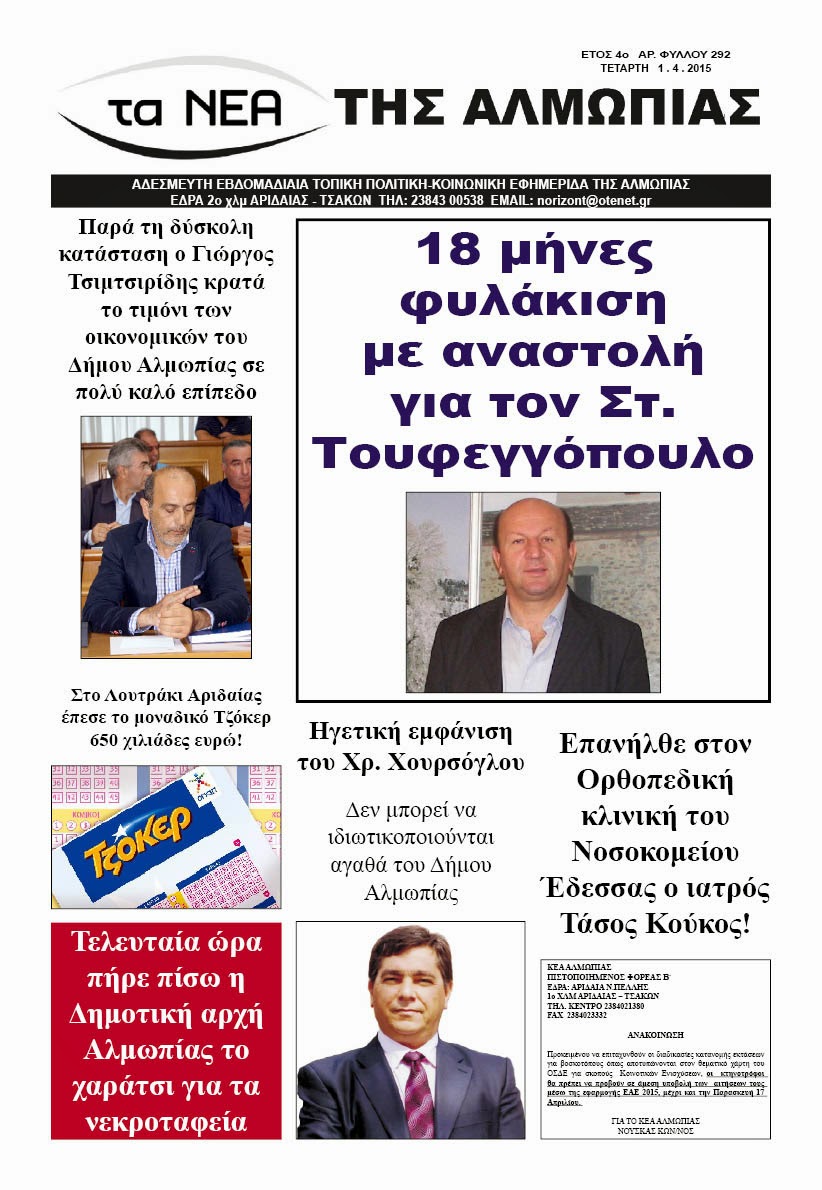 Πρωτοσέλιδα ΕΒΔΟΜΑΔΙΑΙΑ ΕΦΗΜΕΡΙΔΑ ΤΟΥ ΝΟΜΟΥ ΠΕΛΛΑΣ “ΤΑ ΝΕΑ ΤΗΣ ΑΛΜΩΠΙΑΣ” ΤΕΥΧΟΣ 292 Χρήστος Δημητριάδης01/04/2015039 views
