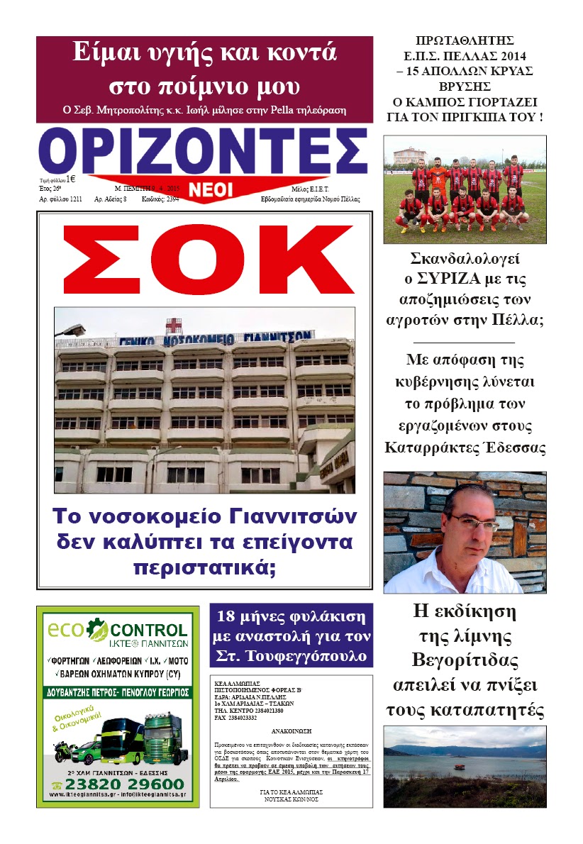 Πρωτοσέλιδα ΕΒΔΟΜΑΔΙΑΙΑ ΕΦΗΜΕΡΙΔΑ ΤΟΥ ΝΟΜΟΥ ΠΕΛΛΑΣ “ΝΕΟΙ ΟΡΙΖΟΝΤΕΣ” ΤΕΥΧΟΣ 1211 Χρήστος Δημητριάδης08/04/2015034 views
