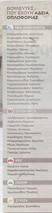 Πιο συγκεκριμένα, και σε ό,τι έχει να κάνει με τις άδειες που έχουν δοθεί από την Αθήνα, έχουν εκδοθεί άδειες οπλοφορίας σε 25 βουλευτές της ΝΔ, σε 14 βουλευτές της Χρυσής Αυγής, σε 5 του ΚΚΕ, σε 2 του ΠΑΣΟΚ, σε 2 των ΑΝ.ΕΛ. και σε 1 του ΣΥΡΙΖΑ, ενώ σε εκκρεμότητα (υπό έκδοση) βρίσκονται δύο ακόμη άδειες.