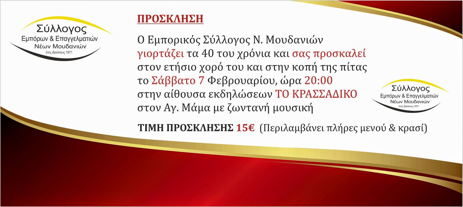 Χαλκιδική ΠΡΟΣΚΛΗΣΗ ΣΤΟΝ ΕΤΗΣΙΟ ΧΟΡΟ ΤΟΥ ΕΜΠΟΡΙΚΟΥ ΣΥΛΛΟΓΟΥ Ν.ΜΟΥΔΑΝΙΩΝ Konstantinos Papadopoulos04/02/2015024 views