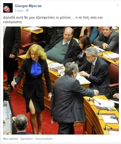 Θετική χροιά δεν είχε ούτε το σχόλιο που έκανε για την ίδια ο δημοσιογράφος Γιώργος Μπέζας μέσα από τον προσωπικό του λογαριασμό στο facebook. Ο καυστικός δημοσιογράφος που πέρσι ήταν στο τηλεοπτικό πλευρό της Χριστίνας Λαμπίρη έγραψε: «Δηλαδή αυτή θα μου εξασφαλίσει το μέλλον;….τι