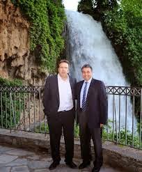 | ο Γενικός γραμματέας της ΕΣΕΕ Γιώργος Καρανίκας με τον Πρόεδρο Βασίλη Κορκίδη με φοντο τους Καταρράκτες |