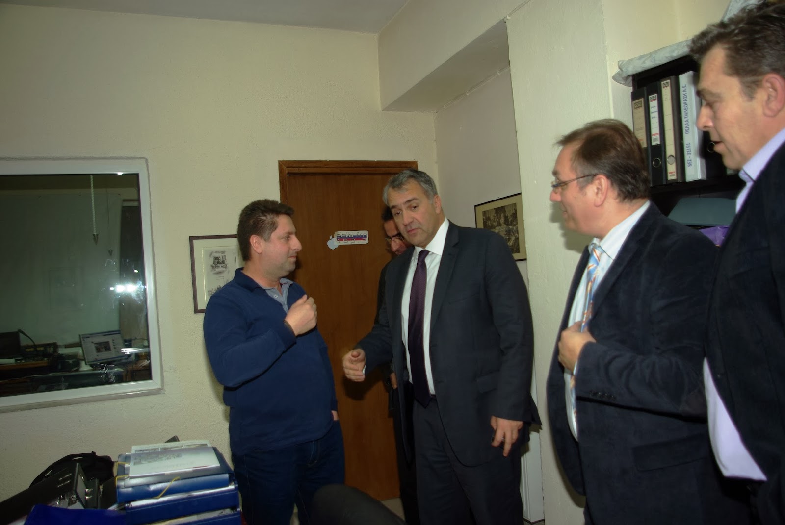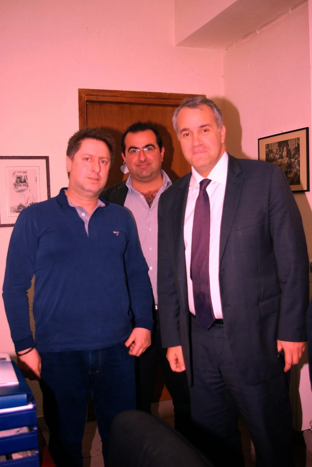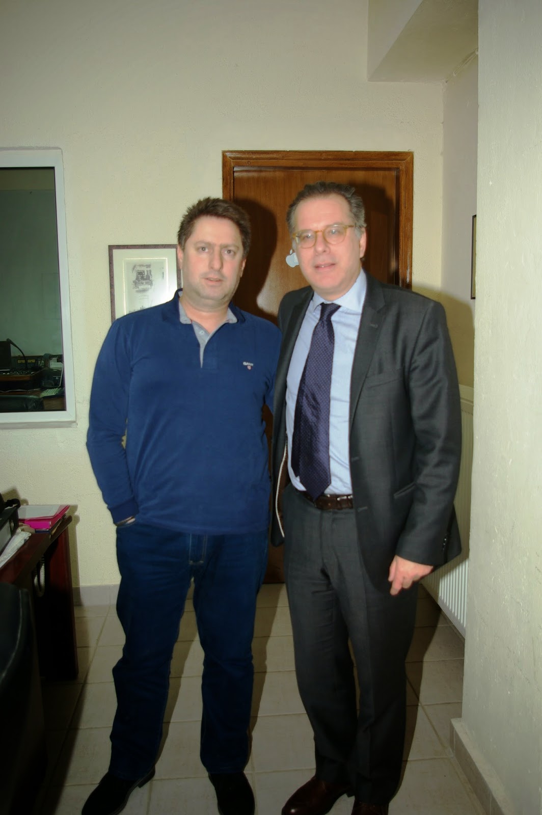 | Ο Ευρωβουλευτής Γιώργος Κουμουτσάκος με τον έναν εκ των ιδιοκτητών της Πέλλα τηλεόραση Άκη Κοσκινόπουλο |