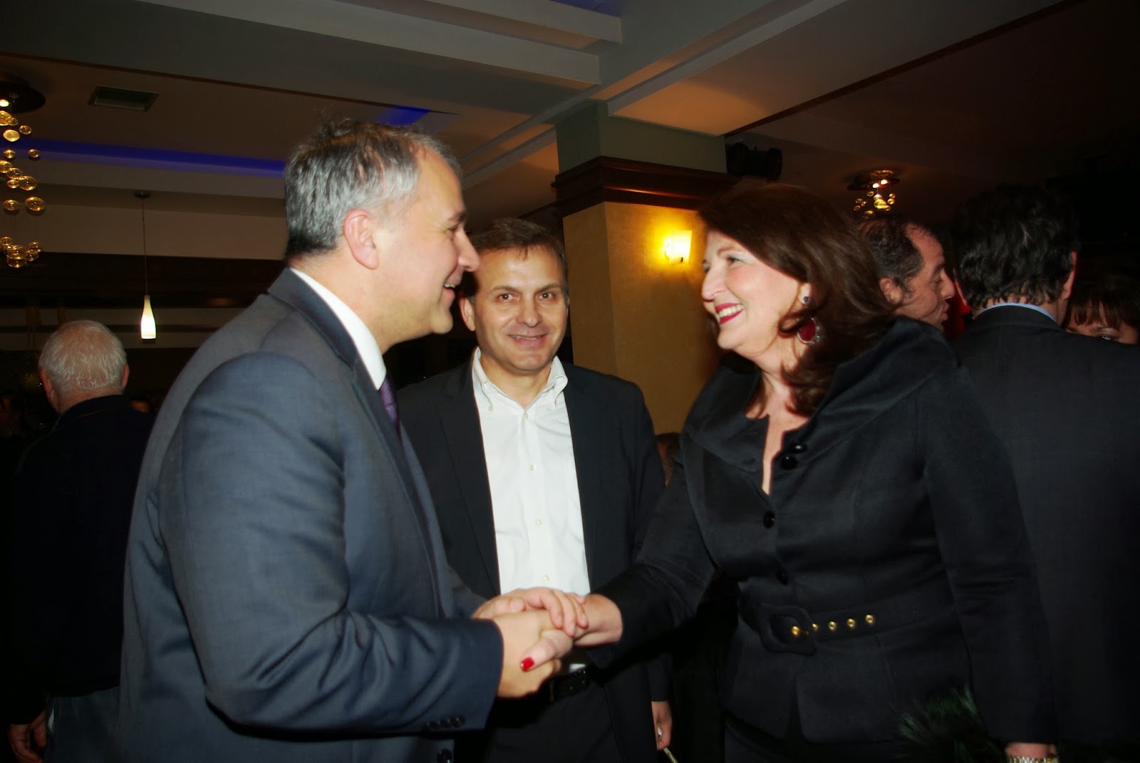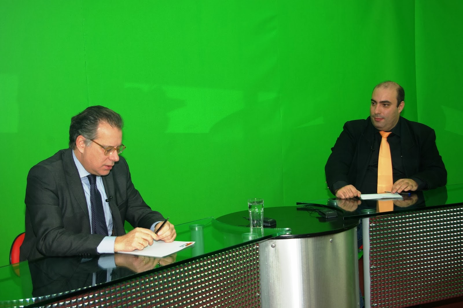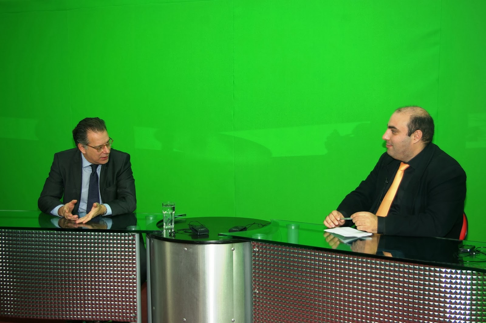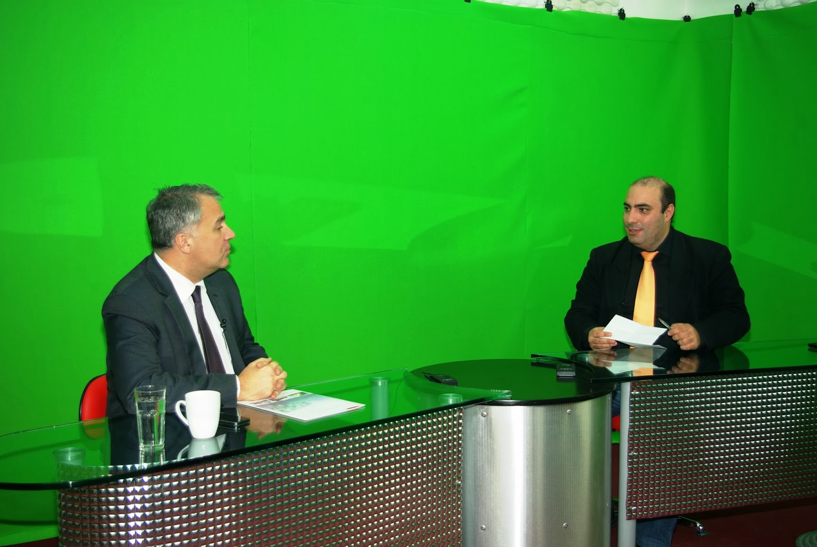 | Ο Ευρωβουλευτής Γιώργος Κουμουτσάκος με τον έναν εκ των ιδιοκτητών της Πέλλα τηλεόραση Άκη Κοσκινόπουλο |