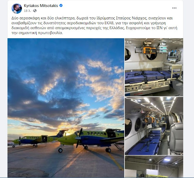 Δύο αεροσκάφη και δύο ελικόπτερα, δωρεά του Ιδρύματος Σταύρος Νιάρχος, ενισχύουν και αναβαθμίζουν τις δυνατότητες αεροδιακομιδών του ΕΚΑΒ, για την ασφαλή και γρήγορη διακομιδή ασθενών από απομακρυσμένες περιοχές της Ελλάδας. Ευχαριστούμε το ΙΣΝ γι’ αυτή την σημαντική πρωτοβουλία.