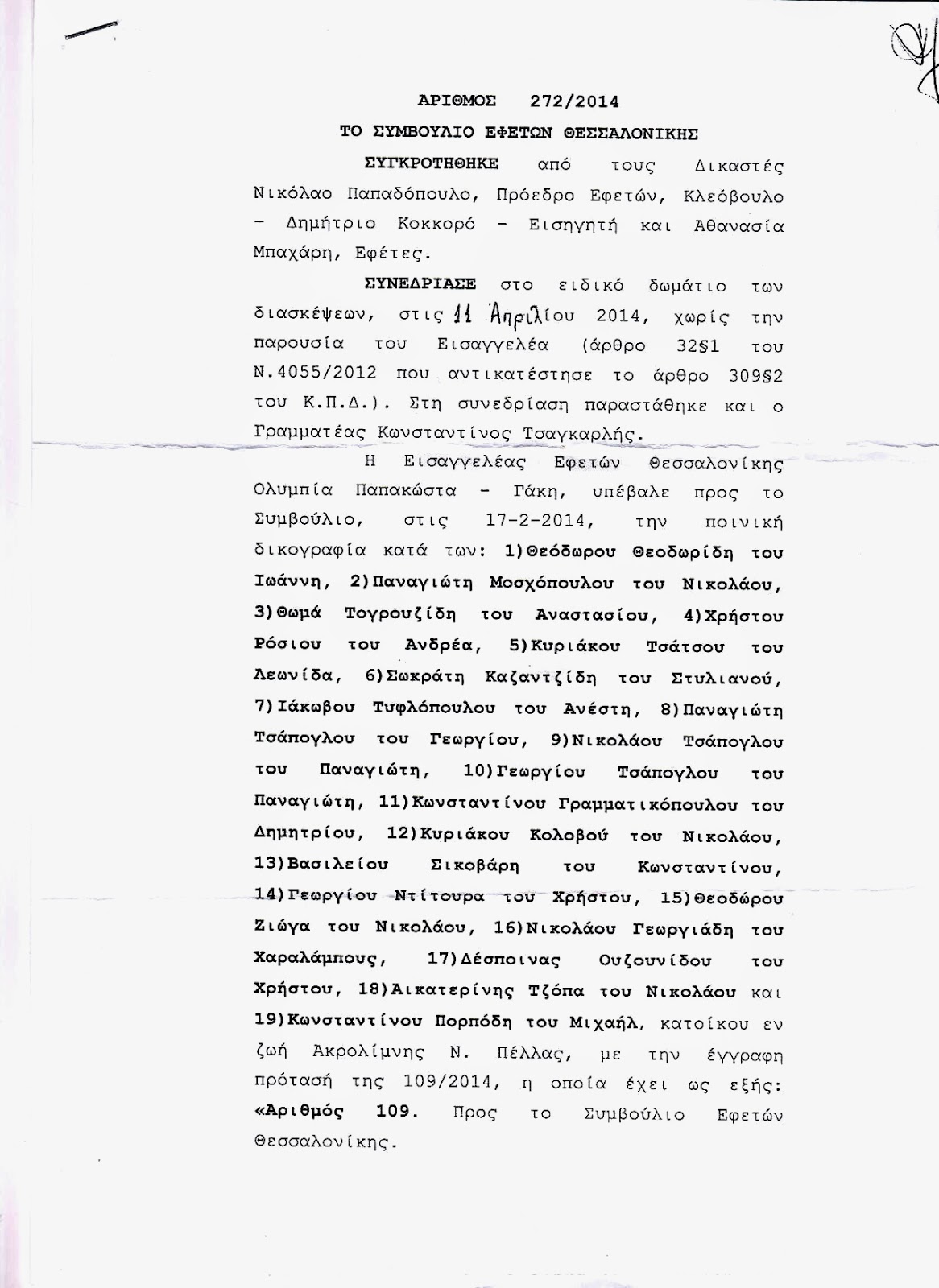 των υπολοίπων μόνο τα αρχικά, εκδόθηκε από το Συμβούλιο Εφετών Θεσσαλονίκης με