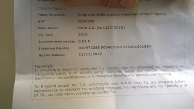 Απίστευτο το Υπουργείο Οκονομικών. Και όμως υπάρχει Εδεσσαίος οφειλέτης της ΔΟΥ Έδεσσας με χρέος 0,01 λεπτό!!! Όλα ξεκίνησαν όταν ο πολίτης μπήκε εχθές 11/11 στο TAXIS για να δει την οικονομική του ταυτότητα. Διαπίστωσε λοιπόν πως υπήρξε η παραπάνω χρέωση και μάλιστα εκτύπωσε και το χαρτί. Τελικά στην Χώρα μας διυλίζουμε τον κώνωπα και καταπίνουμε την κάμηλον! Μετά πως θα δούμε χαΐρι; Άλλο ένα ερωτηματικό είναι το αν θα μπορεί να πάρει φορολογική ενημερότητα. Εμείς πιστεύουμε ότι επειδή ζει στην Ελλάδα, την υποσαχάρια ζώνη της Ευρώπης, στην Χώρα που όλα είναι πιθανά ότι δεν θα μπορέσει!!! Η κυβέρνηση του ΣΥΡΙΖΑ έχει ακόμη λίγο καιρό να διορθώσει αυτά τα ζητήματα και να φτιάξει Ελλάδα. Αν δεν τα καταφέρει και αυτή τότε όλα πάνε χαμένα…