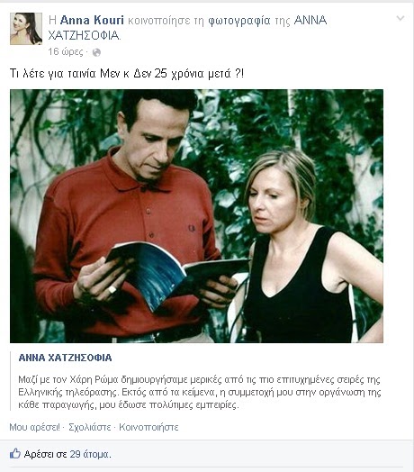 Σύμφωνα, όμως με την ηθοποιό Άννα Κουρή που πρωταγωνίστησε στη σειρά, “Οι Μεν και οι Δεν” θα επιστρέψουν στη μεγάλη οθόνη! Μια ανάρτησή της στον προσωπικό της λογαριασμό στο facebook αρκεί για να πυροδοτήσει τις φήμες περί αναβίωσης του σήριαλ της δεκαετίας του ’90. Μάλιστα, στην ανάρτηση βλέπουμε τους δύο σεναριογράφους, Χάρη Ρώμα και Άννα Χατζησοφιά με το σχόλιο της Άννας Κουρή να είναι το εξής: Τι λέτε για ταινία Μεν κ Δεν 25 χρόνια μετά ?!