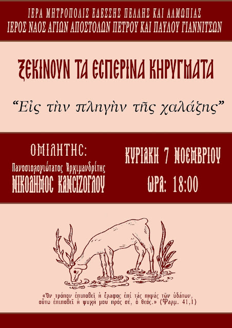 Το πρώτο Εσπερινό Κήρυγμα θα πραγματοποιηθεί την Κυριακή 7 Νοεμβρίου 2021, στις 18.00, αμέσως μετά τον Εσπερινό.