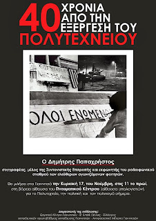 40 χρόνια μετά την εξέγερση του Πολυτεχνείου … ο Δημήτρης Παπαχρήστος συγγραφέας, μέλος της Συντονιστικής Επιτροπής και εκφωνητής του ραδιοφωνικού σταθμού των ελεύθερων αγωνιζόμενων φοιτητών,