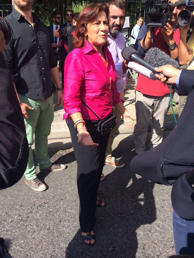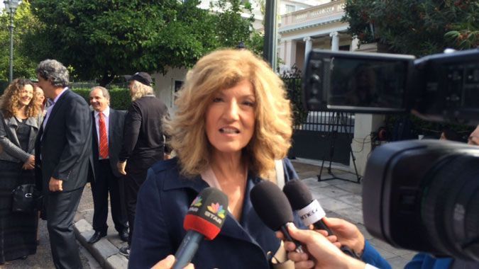 Μπλε σκούρο σακάκι με ασορτί παντελόνι και μπεζ χοντροτάκουνα πέδιλα διάλεξε να φορέσει η Σία Αναγνωστοπούλου, αναπληρώτρια υπουργός Παιδείας.