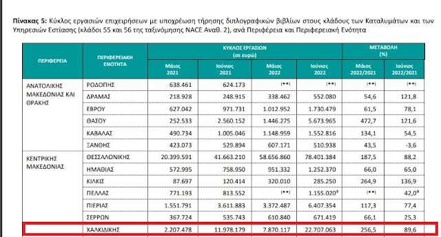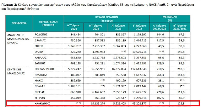 Ειδικότερα, σύμφωνα με τα στοιχεία στο δεύτερο τρίμηνο του φετινού χρόνου εισπράχθηκαν από τον κλάδο των καταλυμάτων στη Χαλκιδική 7.545.957, ενώ το πρώτο τρίμηνο 3.853.090. Το δεύτερο τρίμηνο του 2021 είχαν εισπραχθεί 3.257.858. Η σύγκριση σε α’ Τρίμηνο 2022/2021 παρουσιάζει αύξηση 497,4% και το β’ Τρίμηνο 2022/2021 παρουσιάζει αύξηση 131,6%. Στις Σποράδες το α΄τρίμηνο του 2021 τα έσοδα ήταν 563.309 ευρώ, και το β΄τρίμηνο του ίδιου χρόνου 3.638.657 ευρώ. Το πρώτο τρίμηνο του 2022 τα έσοδα ηταν 1.061.006 ευρώ και το δεύτερο τρίμηνο 15.585.796 ευρώ. Η αύξηση μεταξύ των β’ τριμήνων του 2021 και του 2022 είναι 328,3%.