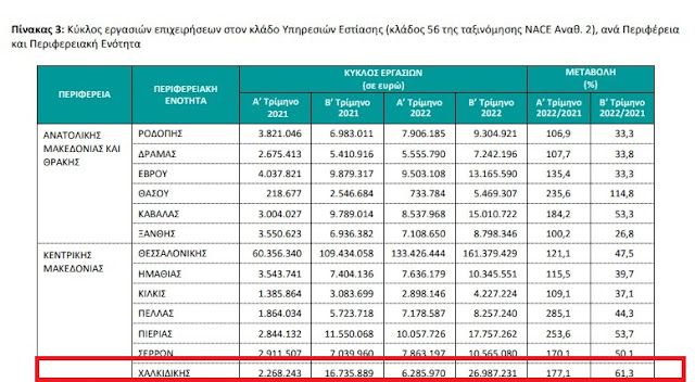 Ο κύκλος εργασιών των επιχειρήσεων στον κλάδο Εστίασης στην Περιφερειακή Ενότητα Χαλκιδικής έχει ως εξής: Το α’ τρίμηνο του 2021 εισπράχθηκαν 5.889.817 ευρώ. Το β΄ τρίμηνο του 2021 εισπράχθηκαν 15.704.032 ευρώ και το α΄τρίμηνο του 2022 εισπράχθηκαν 17.577.206 ευρώ, ενώ το β’ τρίμηνο του 2022 εισπράχθηκαν 23.471.283 ευρώ.