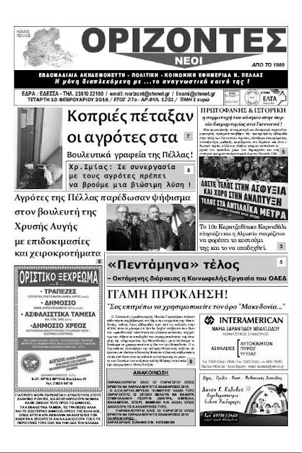 Όπως κάθε εβδομάδα έτσι και σήμερα οι Νέοι Ορίζοντες ανανεωμένοι κυκλοφορούν σε όλα τα περίπτερα του νομού Πέλλας. Όσοι πολίτες επιθυμούν να εγραφούν συνδρομητές και να λαμβάνουν την εφημερίδα στο σπίτι τους, μπορούν να τηλεφωνούν στο 694 961 9315 για πληροφορίες. Ακόμη στο ίδιο νούμερο μπορούν να απευθύνονται όσοι πολίτες ενδιαφέρονται να συνάψουν συνεργασία με την εφημερίδα μας.