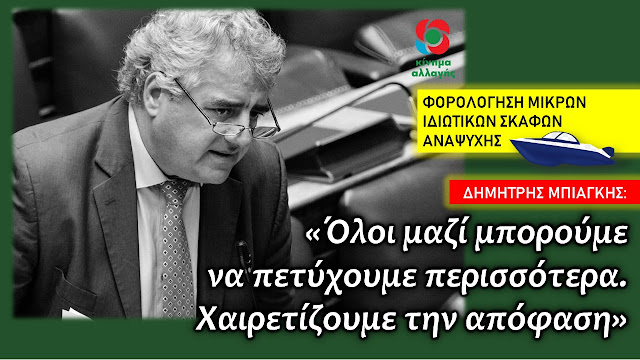 Μετά τη σχετική νομοθετική ρύθμιση με το νόμο 4646/2019 (201’ Α) της κυβέρνησης της Ν.Δ. χιλιάδες ιδιοκτήτες μικρών κυρίως ιδιωτικών σκαφών αναψυχής και βαρκών κλήθηκαν να καταβάλουν έναν επιπρόσθετο άδικο φόρο της τάξης των 1000 ευρώ κατ΄ ελάχιστο ετησίως, Το πρόβλημα αναδείχθηκε από τους ίδιους τους πολίτες και ιδιαίτερα τους νησιώτες οι οποίοι αντέδρασαν άμεσα, όπως έκαναν, μέσω επιστολής τους προς τον πρωθυπουργό, τους αρμόδιους υπουργούς και βουλευτές, οι κάτοικοι των Παξών και Αντίπαξων. Στην παραπάνω κινητοποίηση των πολιτών ανταποκρίθηκε άμεσα ο Υπεύθυνος Ναυτιλίας και Νησιωτικής Πολιτικής και Βουλευτής Κέρκυρας του Κινήματος Αλλαγής, κ. Δημήτρης Μπιάγκης τόσο με την υπ’ αριθμόν Α.Π.: 6365/29-04-2021 Ερώτησή του προς τους Υπουργούς Οικονομικών και Ναυτιλίας και Νησιωτικής Πολιτικής αντιστοίχως, όσο και με σχετική του αρθρογραφία στον τοπικό και αθηναϊκό Τύπο, αναλύοντας τις αρνητικές και δυσμενείς συνέπειες της ρύθμισης, όχι μόνον στους μικρομεσαίους οικονομικά ιδιοκτήτες βαρκών, αλλά και στην ίδια την εθνική οικονομία και στα εθνικά συμφέροντα, παραθέτοντας παράλληλα προτεινόμενες τεκμηριωμένες και εφαρμόσιμες διορθωτικές λύσεις.