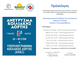 Σας αποστέλλουμε το πρόγραμμα της δράσης Προσυμπτωματικού Ελέγχου Ανευρύσματος Κοιλιακής Αορτής με Δωρεάν Υπερηχογράφημα.