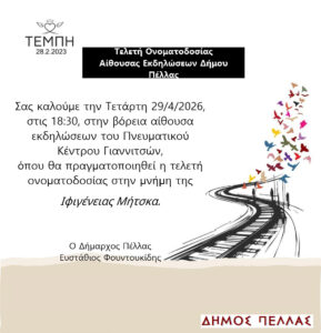 Δήμος Πέλλας: Εκδήλωση Ονοματοδοσίας της βόρειας αίθουσας του Πνευματικού Κέντρου Γιαννιτσών σε «Αίθουσα Ιφιγένεια Μήτσκα»