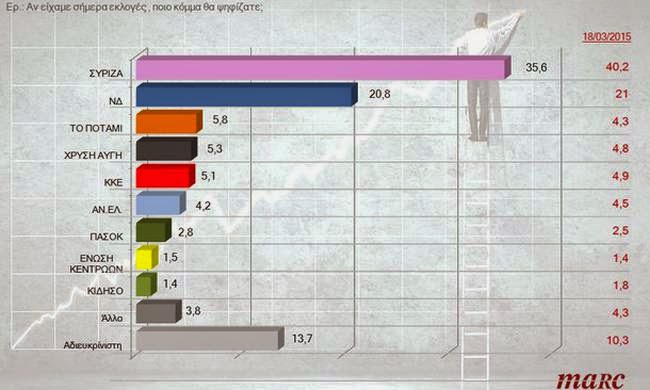 ποσοστιαίες μονάδες έναντι της Νέας Δημοκρατίας στην πρόθεση ψήφου, δείχνει δημοσκόπηση που πραγματοποίησε η εταιρία Marc.