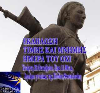 Την 28η Οκτωβρίου κάνουμε το αυτονόητο. Τιμούμε τους προγόνους μας που πολέμησαν και έδωσαν τα πάντα για την ελευθερία της πατρίδας μας. Όλοι οι Έλληνες δίνουμε το παρών στην εκδήλωση τιμής και μνήμης την Τετάρτη 28η Οκτωβρίου ώρα 11.00 π.μ στο άγαλμα της γυναίκας της Πίνδου στη Θεσσαλονίκη. Θα είμαστε όλοι εκεί.