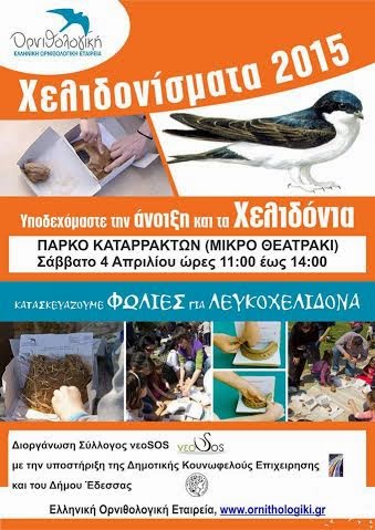 Το Σάββατο 4 Απριλίου 2015, από τις 11:00 το πρωί έως 14:00 το μεσημέρι, στο Πάρκο των Καταρρακτών, θα λειτουργεί εργαστήρι κατασκευής χελιδονοφωλιών όπου μπορούν να συμμετέχουν παιδιά και γονείς, κατασκευάζοντας τη δική τους χελιδονοφωλιά και στέλνοντας το δικό τους ανοιξιάτικο μήνυμα.