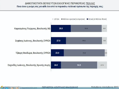 Ειδικότερα υπήρξε ερώτηση για την δημοτικότητα των 4 Βουλευτών Θεοδώρας Τζάκρη και Γιάννη Σηφάκη από τον ΣΥΡΙΖΑ, του Γιώργου Καρασμάνη από τη Νέα Δημοκρατία και του Γιάννη Σαχινίδη από την Χρυσή Αυγή. Ακόμη υπήρξε ερώτημα για τον Δήμαρχο Πέλλας Γρηγόρη Στάμκο.