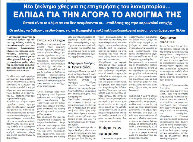 • Ξαναζωντάνεψαν οι εμπορικοί δρόμοι της πόλης της Πέλλας, καθώς η επαναλειτουργία των επιχειρήσεων λιανεμπορίου έβγαλε έξω πολλούς καταναλωτές, δίνοντας ζωή στην αγορά, η οποία για μεγάλο χρονικό διάστημα είχε κατεβάσει ρολά, πλην της εορταστικής περιόδου που λειτουργούσε με τη μέθοδο του «click away»!