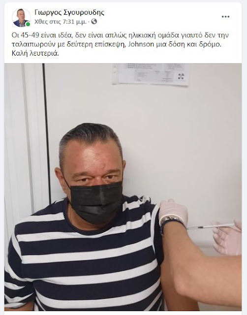 Ο Συντονιστής της Νομαρχιακής του ΣΥΡΙΖΑ νομού Πέλλας Γιώργος Σγουρούδης εμβολιάστηκε, στέλνοντας το μήνυμα πως ο μόνος τρόπος για να απαλλαγούμε από τον Ιό, είναι ο εμβολιασμός. Ο κος Σγουρίδης μάλιστα έστειλε και μήνυμα τονίζοντας ότι αποτελεί μια καλή επιλογή, το μονοδοσικό εμβόλιο το οποίο και έκανε. Ο κος Σγουρούδης μάλιστα ευχήθηκε Καλή Λευθεριά!!!