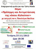 διοργανώνετε η 2η εκδήλωση με θέμα: «Πρόληψη και Αντιμετώπιση της Νόσου Alzheimer» την Τετάρτη 27/11/2013 και ώρα 18:30