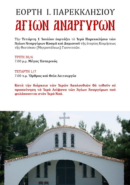 Την Τετάρτη 1 Ιουλίου εορτάζει το Ιερό Παρεκκλήσιο των Αγίων Αναργύρων Κοσμά και Δαμιανού της ενορίας Κοιμήσεως της Θεοτόκου (Μητροπόλεως) Γιαννιτσών επί της οδού Γιαννιτσών – Πενταπλατάνου.