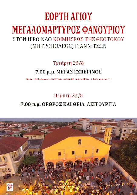 Την Παρασκευή 27 Αυγούστου ο Ιερός Ναός Κοιμήσεως της Θεοτόκου Γιαννιτσών εορτάζει την μνήμη του Αγίου Μεγαλομάρτυρος Φανουρίου.