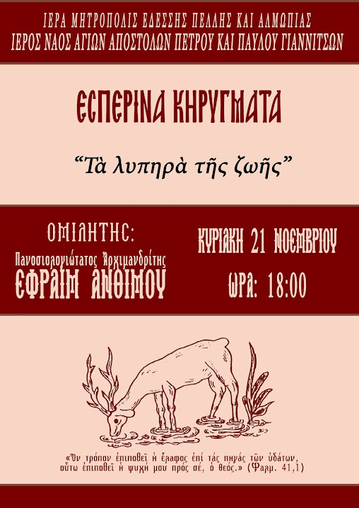 Την Κυριακή 21 Νοεμβρίου, στις 18.00, στα πλαίσια των Κυριακών Εσπερινών Κηρυγμάτων που πραγματοποιούνται στον Ιερό Ναό των Αγίων Αποστόλων Πέτρου και Παύλου Γιαννιτσών θα ομιλήσει ο Πανοσιολογιώτατος Αρχιμανδρίτης Εφραίμ Ανθίμου, Ιεροκήρυκας της Ι. Μητροπόλεως και αδελφός της Ι. Μονής Οσίου Διονυσίου του εν Ολύμπω, με θέμα: «Τα λυπηρά της ζωής».