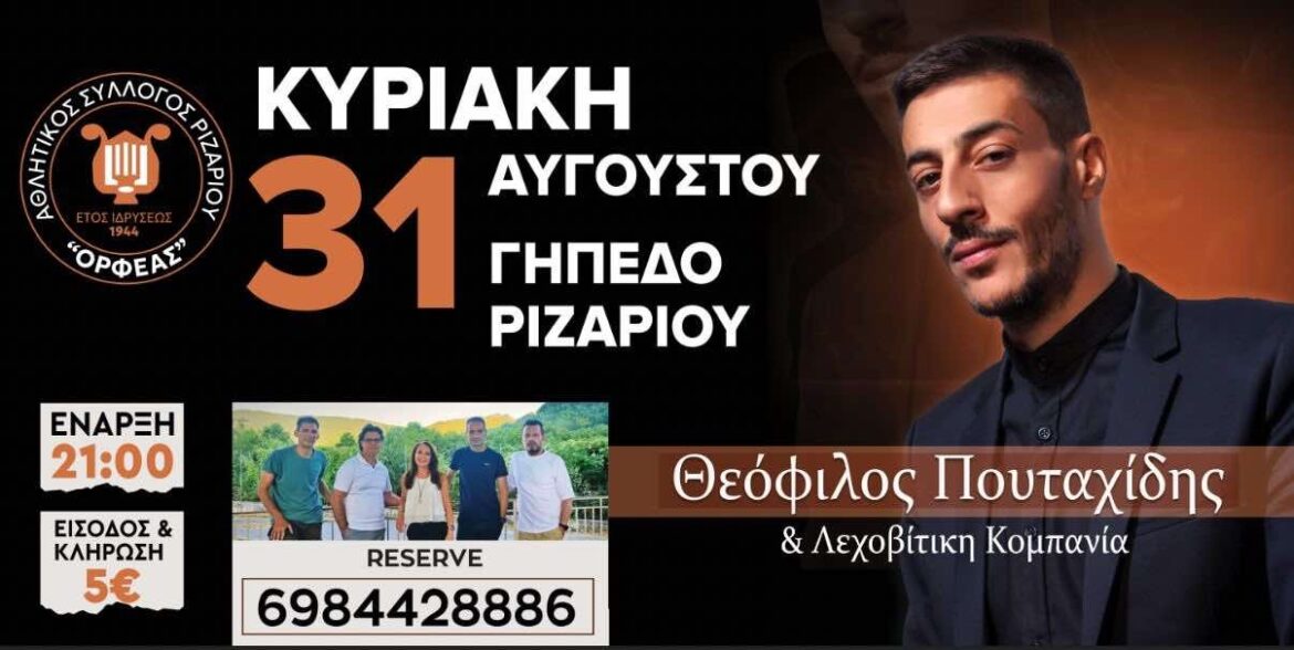 Ο Πολιτιστικός Αθλητικός Σύλλογος “Ορφέας Ριζαρίου” διοργανώνει τον ετήσιο χορό του την Κυριακή 31 Αυγούστου, στις 21:00, στο Δημοτικό Στάδιο Ριζαρίου.